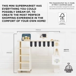 - Stand polccal, pénztárgép, futószalag, szkenner, játékpénz, fizető/jutalom/hűségkártyák, „következő vásárló” felirat, írótábla és különleges ajánlat tábla, pamuttáska, vegyes fa élelmiszerek