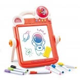 A rajzfelület tiszta, szárazon törölhető, 8 színes filccel, szivaccsal és 18 kétoldalas kártyával az újra és újra történő rajzoláshoz és íráshoz.