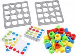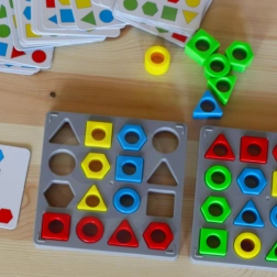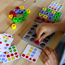 A játék elve: A játékosoknak a húzott kártya alapján kell összeállítaniuk a mintát a táblán. Fontos fenntartani a geometriai formák elrendezését és színeit is.