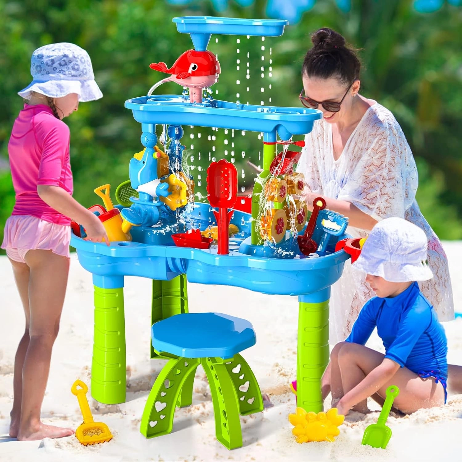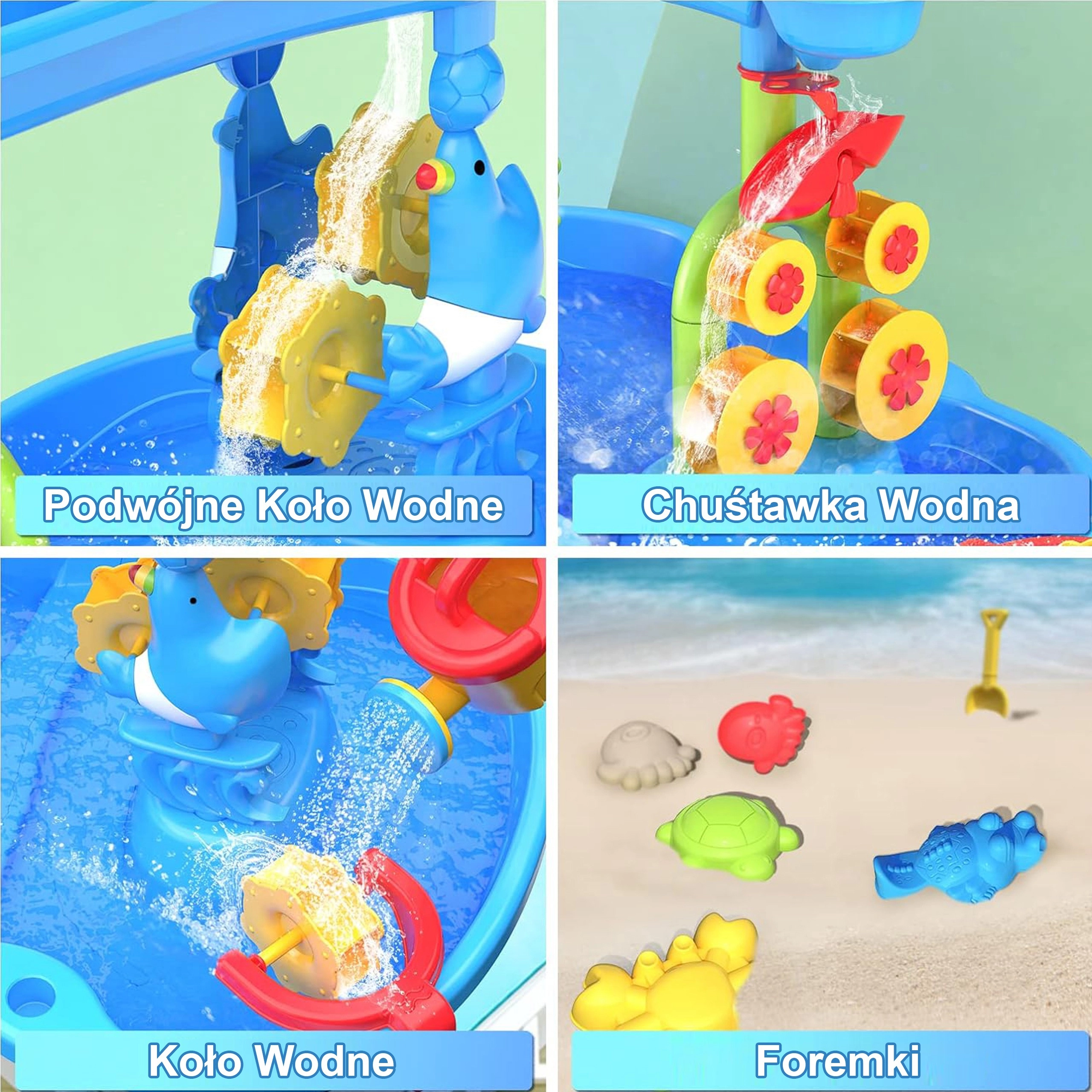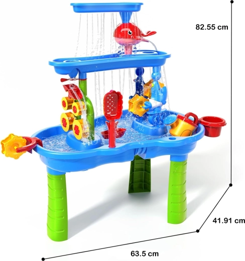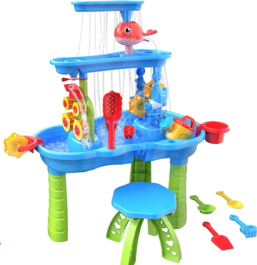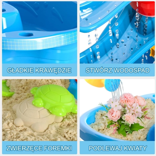 A WOOPIE XL víz- és homokasztal egész éves szórakozást kínál – nyáron hűsítő vizes játékokat, hűvösebb időben pedig alkotást homokkal vagy kinetikus homokkal. A 3 szintes kaszkádrendszernek köszönhetően a gyerekek a felső tartályba öntenek vizet, figyelik, ahogy az áramlás megforgatja a vízikerekeket és malmokat, majd az alsó tálcákba folyik. A készlet része egy székecske és egy széles eszközkészlet a játékhoz és kísérletezéshez.
