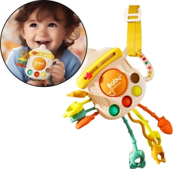 - Sok színes zsinórt és húzható, tologatható elemet tartalmaz, amelyek aktivitásra és felfedezésre ösztönzik a gyermeket.
