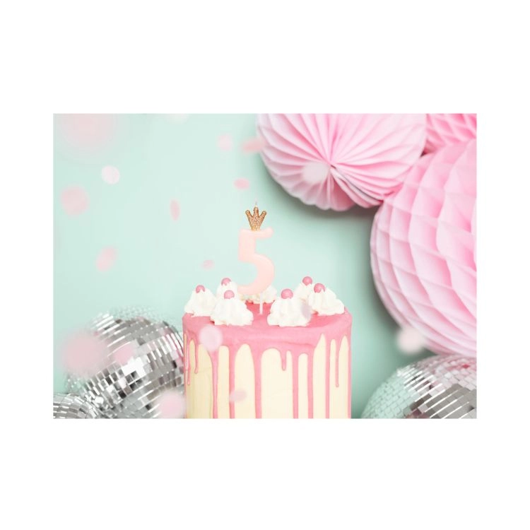 Egyedi rózsaszín koronás születésnapi gyertya gyerek bulikhoz. Tökéletes dísz bármilyen születésnapi tortához, és sok örömet hoz.