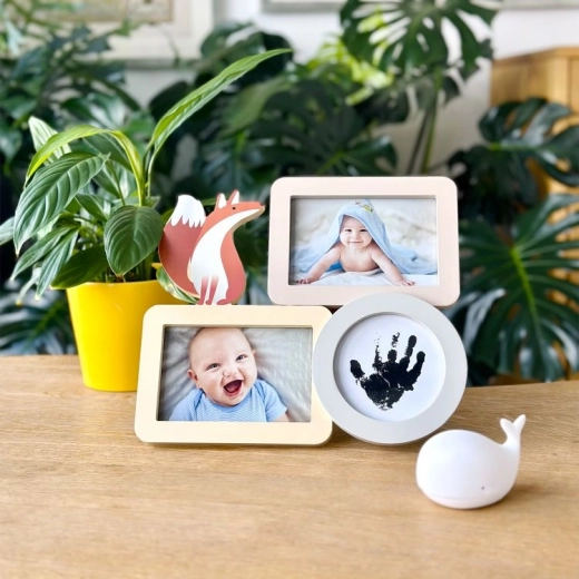 Őrizze meg gyermeke életének első éveiből származó emlékeket ezzel az elegáns, 2 fotónak és lenyomatoknak helyet adó fotorámmal. Tökéletes ajándék friss szülőknek.