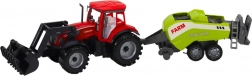 Vörös traktor rakodóval és szénabálázóval – műanyag farmjáték
