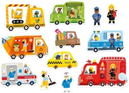 Induljatok felfedező útra! A párosító, autós témájú gyermekpuzzle 8 egyszerű, kétdarabos képet tartalmaz (pl. tűzoltóautó, kukásautó, mentőautó és taxi) és 4 önálló figurát. A gyerekek gyakorolják a szem–kéz koordinációt, bővítik szókincsüket, és örömüket lelik minden sikeres illesztésben.