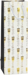 Stílusos, erős papírból készült ajándéktáska palackhoz, ideális bor vagy pezsgő átadásához. Elegáns megjelenést, masszív kivitelezést és biztonságos hordozást kínál zsinórfüleinek és a megerősített aljnak köszönhetően. Arany akcentussal díszített minta és négy színváltozat, amely remekül illik ünnepségekhez és különleges alkalmakhoz.