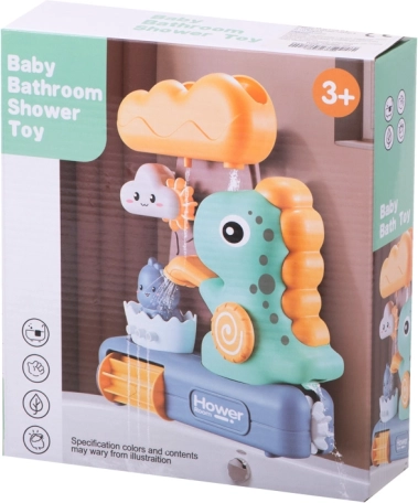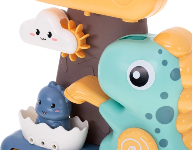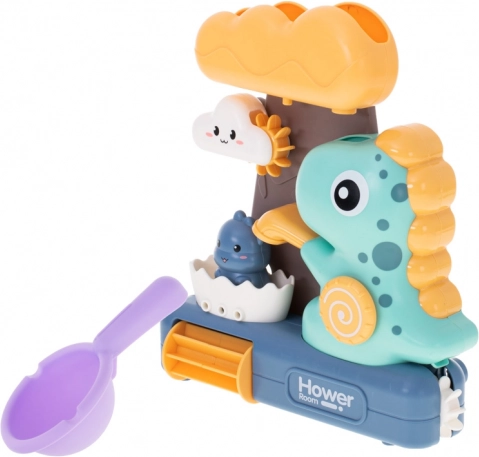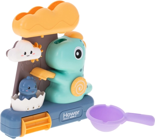 A dinoszauruszos fürdőjáték vízi kerékkel nagyszerű módja a kisgyermekek fürdetésének megfűszerezésére. A játék abból áll, hogy vizet öntenek a nagy felhő formájú felső tartályba, ahonnan a víz önmagától folyik át a játék összes részén, vizuális szórakozást biztosítva a gyermekek számára.
