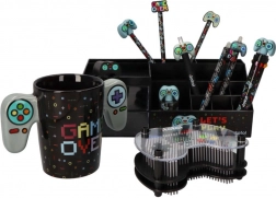 Fekete kerámia színes, pixeles felirattal és ikonokkal, amely játékos hangulatot kölcsönöz az asztalodnak, és remek ajándék gamer barátoknak.