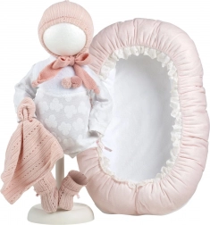A 40–42 cm-es méretű babának készült babaruha egy 4 részes szett része, amely három ruhadarabot, egy díszes rongyikát és egy fészekkét tartalmaz. Kézzel készült Spanyolországban, 3 éves kortól ajánlott.