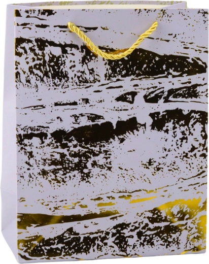 Ez az elegáns és időtálló ajándéktáska ezüst árnyalatban, szabálytalan arany mintával, stílusos csomagolás, amely önmagában is vonzza a figyelmet, és kiemeli az ajándék különleges jellegét. Az arany akcentusok csodásan csillognak a fényben, ami luxus és modern megjelenést kölcsönöz a táskának, biztosan lenyűgözve az ajándékozott személyt.