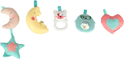 - Puha játékok és csörgők: A hozzá tartozó puha játékok és színes műanyag csörgők ösztönzik a babát a játékra, és segítenek fejleszteni az érzékeiket és motoros képességeiket.