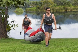 Induljon vízre a kétszemélyes felfújható Bestway kajakkal, amely ideális társ rekreációs túrákra tavakon vagy medencékben. Ez a kajak tartós vinil anyagból készült, amely ellenálló a sérülésekkel szemben. Tágas és kényelmes pilótafülkéje két felfújható üléssel és puha háttámaszokkal van felszerelve, ami kényelmet biztosít még hosszú túrák során is.