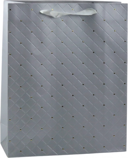 Ez a stílusos szürke ajándéktáska tökéletes választás azoknak, akik előnyben részesítik a modern eleganciát és a klasszikus megjelenést. Finom színe geometriai mintával és arany pöttyökkel kombinálva kifinomult megjelenést kölcsönöz, ideális esküvőkre és ünnepélyes alkalmakra.