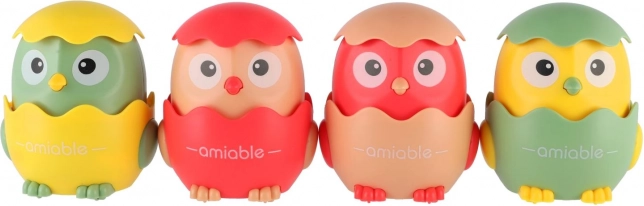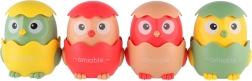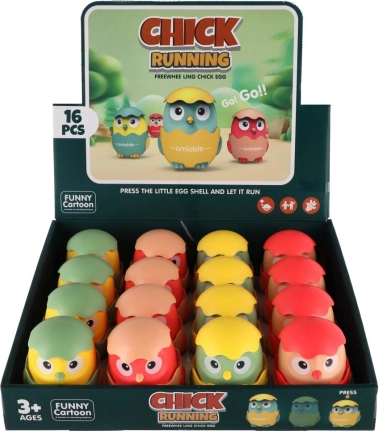 Nyomd meg és indulj! A vidám csibe színes „tojáskabátban” megnyomás után a lendkerekes mechanizmusnak köszönhetően elindul. A játék támogatja a finommotorika fejlesztését, a kéz–szem koordinációt és a gyerekek természetes kíváncsiságát.