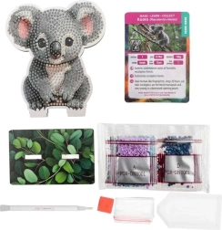 Ez a kreatív hobbi gondosságot és türelmet igényel, de a jutalom egy gyönyörű kép, amelyet büszkén kiállíthat. A csomag tartalmaz egy előnyomott képpel ellátott fából készült koala formájú táblát, egy fa állványt, applikációs tollat, tálkát, ragasztó viaszt és színes kövek készletét.