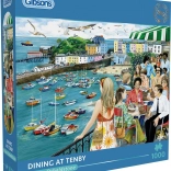 Gazdagítsa szabadidejét a Gibsons márka festői puzzle-jával. A 'Vacsora Tenbyben' téma elrepíti önt egy élettel és színekkel teli kis tengerparti városkába. Ez a puzzle ideális minden részletes illusztrációk és nagyobb kihívások kedvelőinek.
