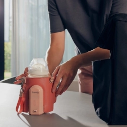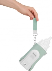 Melegítőjét kényelmesen fel tudja tölteni USB-C csatlakozóval konnektorból, powerbankból vagy akár autóból. Könnyen hordozható hevederrel is rendelkezik, amelyet a babakocsi markolatához vagy táskához lehet rögzíteni. Biztonsági kezelőgomb, amely biztosítja, hogy a melegítő csak az üveg behelyezése után induljon el.
