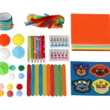 Színes pomponok, zseníliadrótok, hab-/filcformák, pálcikák, ceruzák és kiskutyás matricák – minden, ami dekorációk, kollázsok és képek egyszerű elkészítéséhez kell.