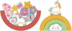 21 darabos egyensúlyozó játék Egyszarvú dizájnnal kicsiknek. Fa játék, amely végtelen játéklehetőségeket kínál. Ideális a finommotorika fejlesztésére, valamint a méretek és színek megismerésére.