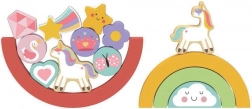 Fedezd fel a játék varázsát, amely a beillesztős puzzle-t és az egyensúlyozó játékot egyesíti. Alapból és 14 beillesztős darabból áll. Hagyd, hogy a gyerekek próbára tegyék türelmüket és kreativitásukat azáltal, hogy színes darabokat egymásra raknak.