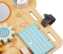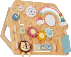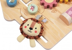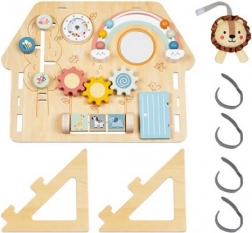 Oroszlán mintájú ház alakú aktív tábla stimulálja a gyermekek érzékszervi észlelését a finom színeknek, aranyos képeknek és különböző felületi textúráknak köszönhetően. A gyerekek szeretik az olyan tevékenységeket, mint a gyöngylabirintus, a forgató és toló képtáblák állatfigurákkal. Ez a játéktábla támogatja a kéz-szem koordinációt és a képzelőerőt is.