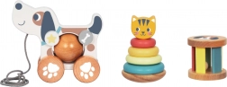 A játékok FSC® tanúsítvánnyal rendelkező fából készültek és nem mérgező festékekkel vannak bevonva, melyek finom árnyalatokban és a fa természetes színében pompáznak. Ez a készlet ajándéknak is kiváló, és garantálja a szórakozást és biztonságot 1 éves kortól.