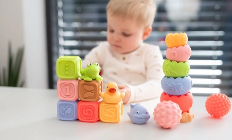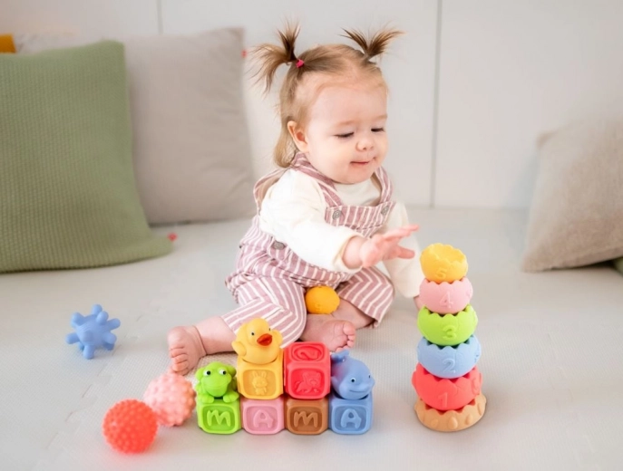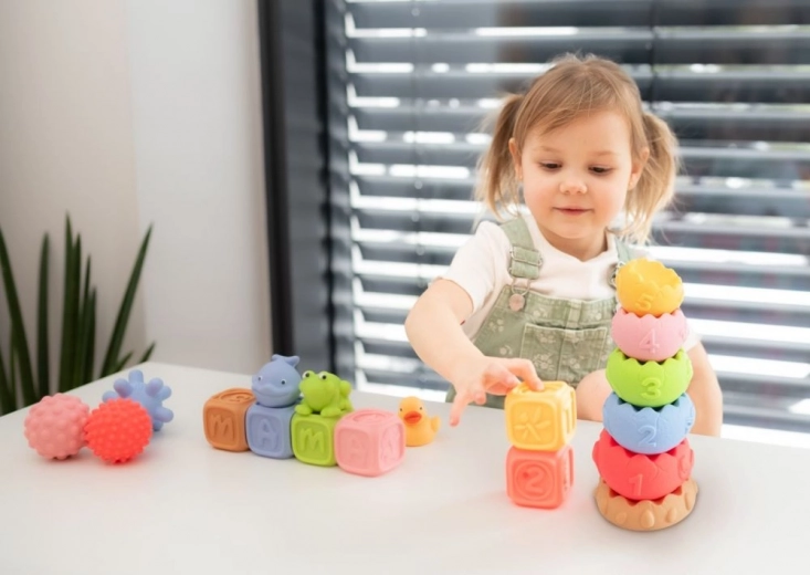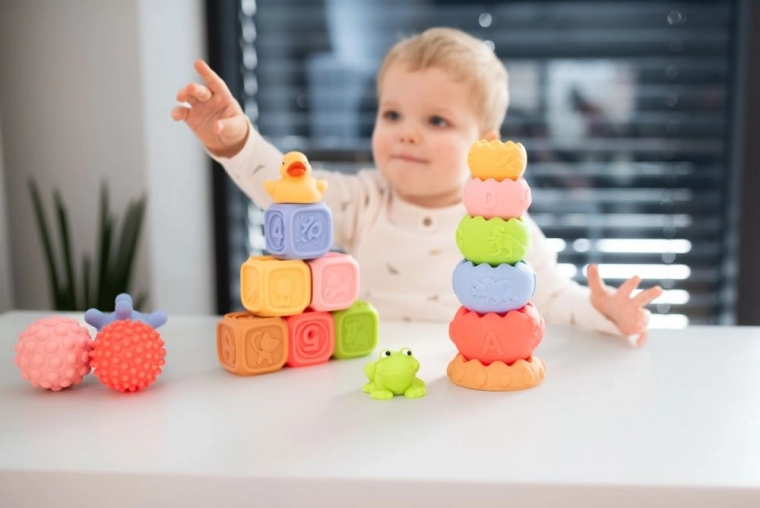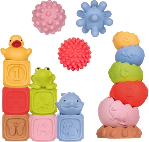 Nagy érzékszervi játékkészlet Tullo ideális fürdéshez, mivel a játékok nem tartalmaznak lyukakat. A puha anyag és a masszázs kidudorodások biztonságos használatot garantálnak, mint rágókák.