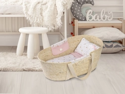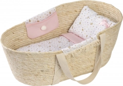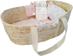 Ez a gyönyörű Mózes kosár mindkét oldalán textil zsebekkel van felszerelve, és díszes vánkos, párna és matrac tartozik hozzá. 40-45 cm-es babákhoz alkalmas, de kiválóan szolgálhat tárolóként további játékok, például plüssállatok számára is.