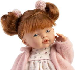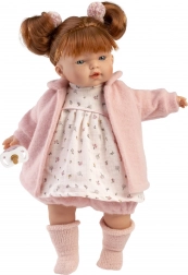 Beszélő és síró baba puha szövet testtel, teljes fejfedéssel és minőségi lágyított vinil anyaggal. A cumi eltávolítása után olyan hangokat ad ki, mint "mama" és "papa", és valósághűen sír.