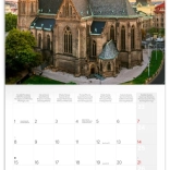 A naptár ikonikus prágai műemlékeket tartalmaz, mint például katedrálisok, hidak és történelmi utcák.