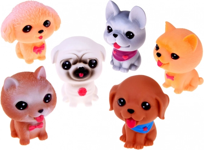 Színes 6 darabos kutya gumifigurák készlet, ideális gyerekeknek új gyűjtemény kezdetének. Kiváló minőségű kialakítás sípoló funkcióval.