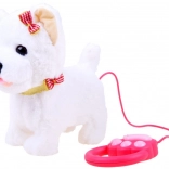 A póráz csatlakoztatása és a gomb megnyomása után a kutyus elindul és ugat – a gyerekek otthon és rövid sétákon is vezethetik.
