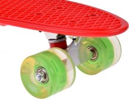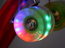 A tartós anyagból készült kerekek gumi borítással kiváló tapadást és rugalmas rezgéscsillapítást nyújtanak. A beépített LED diódák, amelyek a mozgás közben világítanak, egyedi megjelenést kölcsönöznek a gördeszkának és növelik a felhasználó láthatóságát – elemek nélkül! A diódák mágneses energiával működnek, amit a kerekek forgása generál.