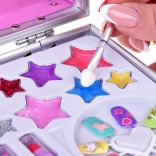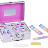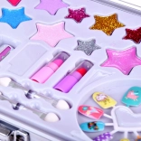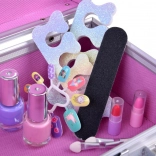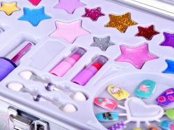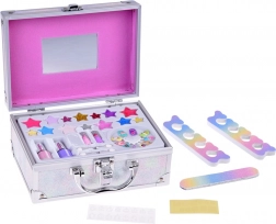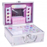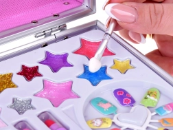 A koffer mindent tartalmaz a szórakoztató sminkeléshez: körömlak, rúzsok, szemhéjfestékek, applikátorok, műkörmök és matricák. A könnyebb sminkelés érdekében belül egy tükör is található.