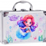 Fedezze fel a csillogó kozmetikai koffer varázsát, amely sellő grafikával van díszítve, elbűvölő púder árnyalatokkal és csillogó réteggel. Ez a kompakt koffer erős fém elemekkel van ellátva, melyek védenek a sérülésektől, és ezüst csattal biztosítják a biztonságos zárást. Praktikus műanyag fogantyú a tetején megkönnyíti a hordozást.