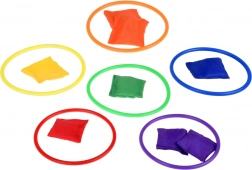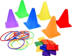 Ez a játékkészlet ideális azoknak a gyerekeknek, akik szívesen töltenek időt aktívan. Tartalmaz hat színes kúpot, tizenkét textilzsákot és tizenkét műanyag karikát, amelyek változatos játékokat tesznek lehetővé. A gyerekek fejleszthetik koordinációjukat és pontosságukat a dobás és célzás során.