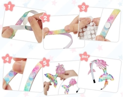 A kreatív készlet Hableány minden kislány álmát valóra váltja. Tartalmaz mindent, ami saját fejpánt készítéséhez szükséges, beleértve a 6 fejpántot pasztell színekben, dekorációkat, mint például fényes szalagok, farokak, kagylók, csillagok, szívek, masnik, korona és hableányok. Mindezek öntapadós matricákat tartalmaznak, melyek nem igényelnek ragasztót vagy ollót. Biztonságos és egyszerű a kisgyermekek számára.<0p>