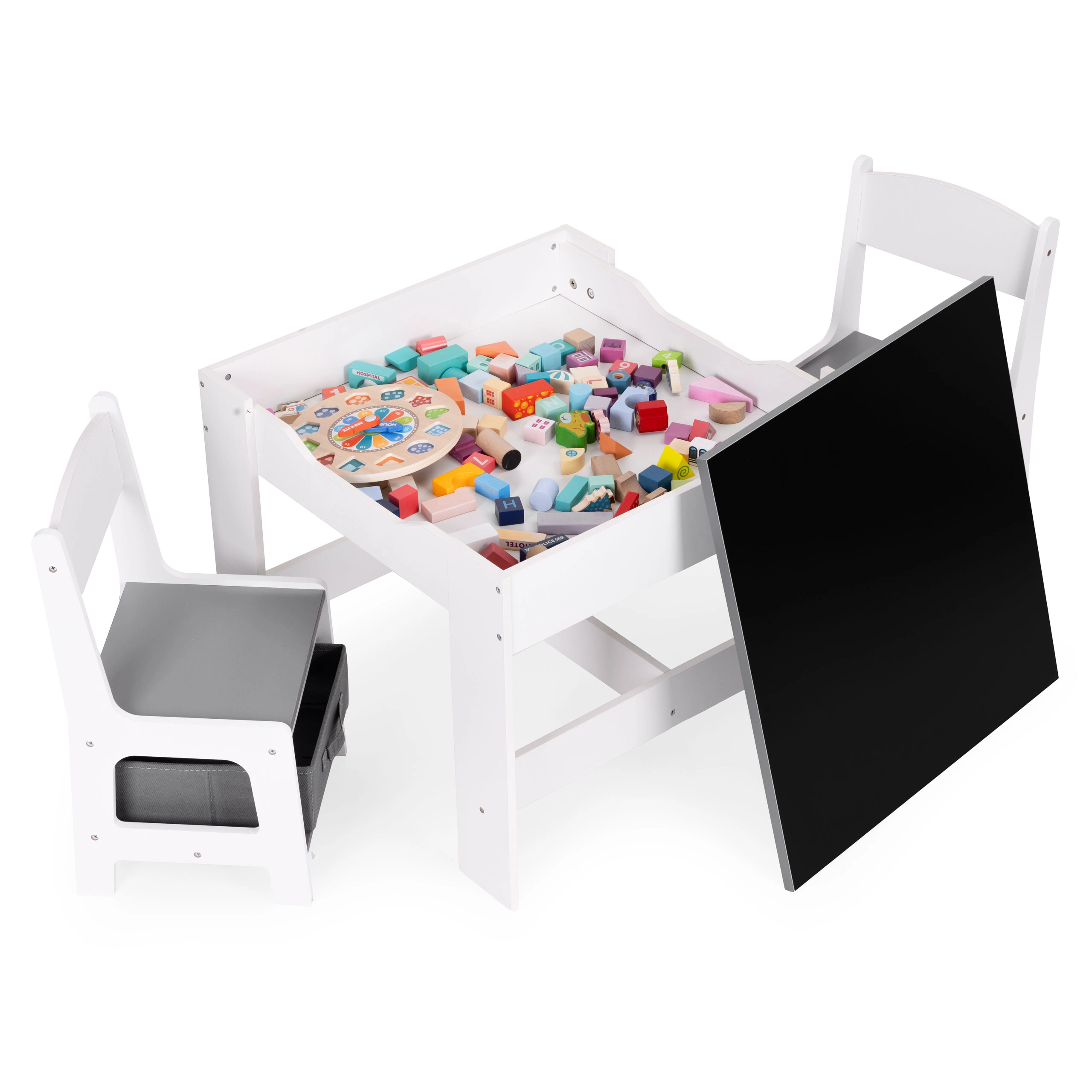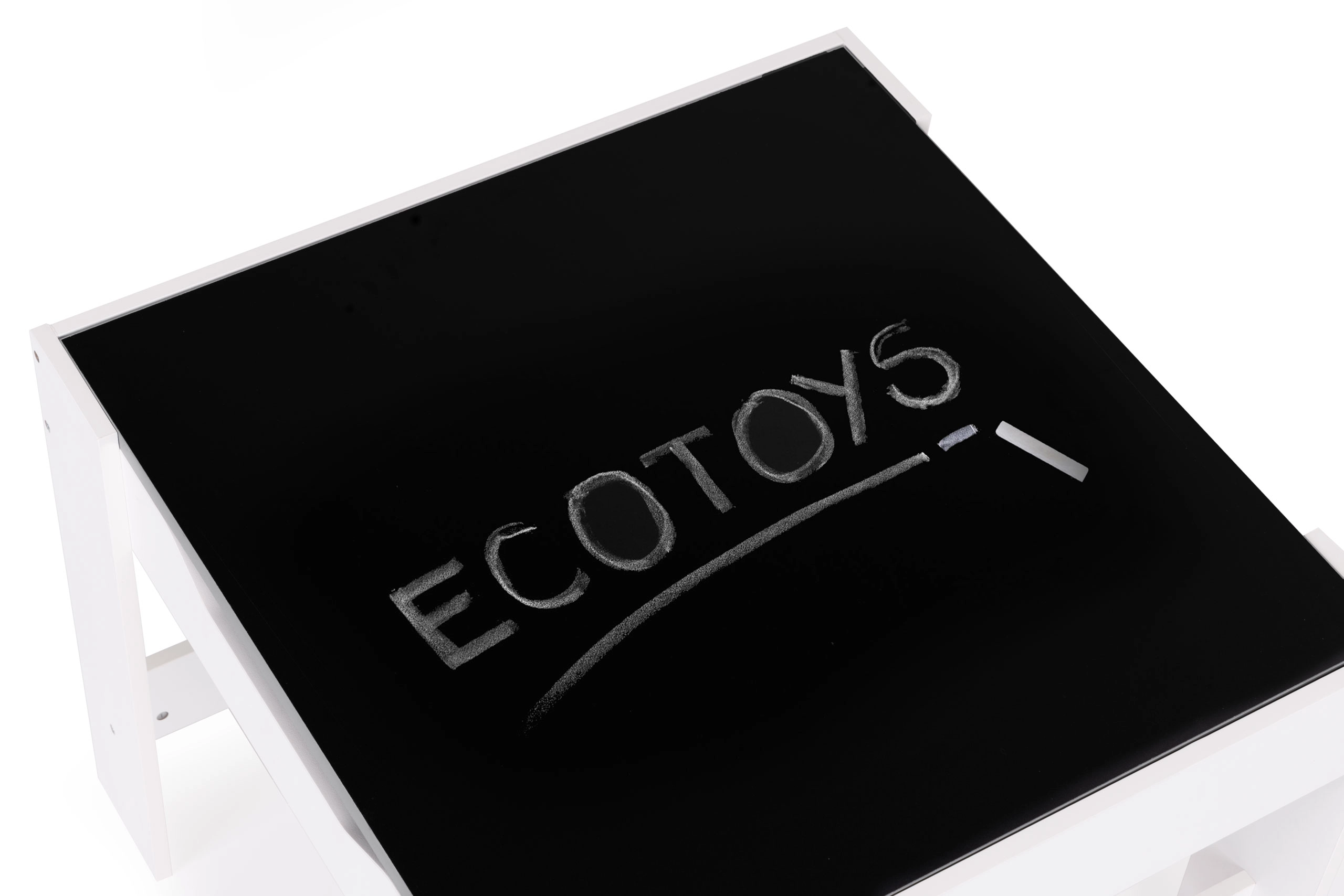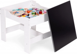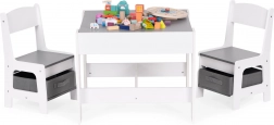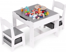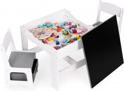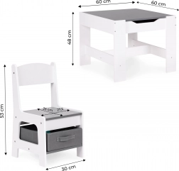 Az ECOTOYS gyerek bútor szett ideális játékhoz és pihenéshez. Tartalmaz 2 széket és egy asztalt tartós MDF szerkezettel. Az asztal része egy kétoldalas, levehető tábla krétás táblával, amely játékra és a gyerekek oktatására is szolgál, segíti a finommotorika és a kreativitás fejlődését.