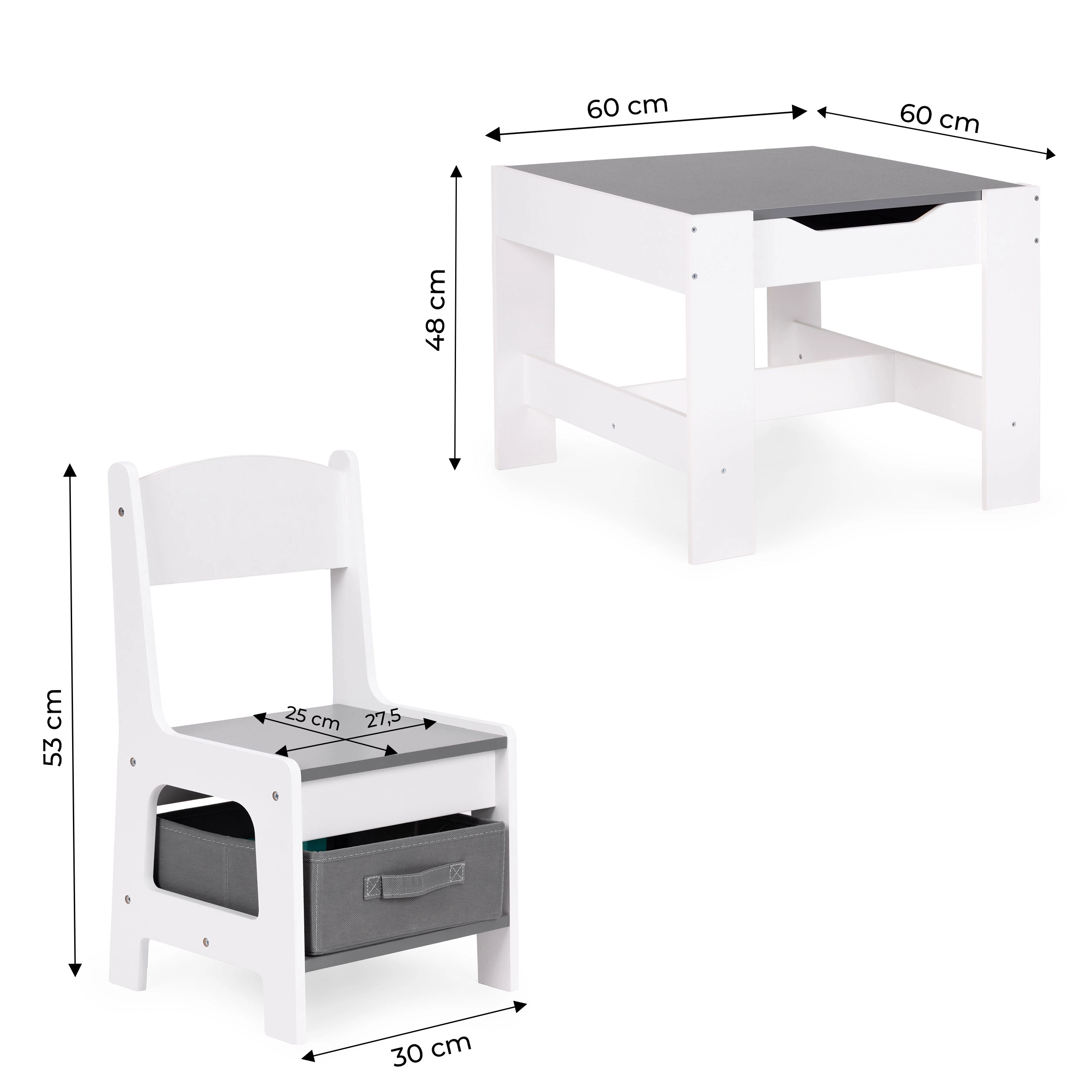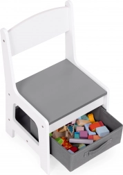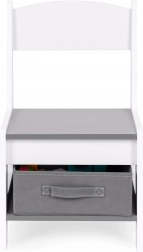 Tárolóhely az asztallap alatt, amely helyet kínál a játékok és kiegészítők számára. A székek praktikus szövet fiókokkal vannak felszerelve, amelyek mindig kéznél tartják az összes fontos dolgot. Az okos tervezésnek köszönhetően a gyerekek könnyedén szervezhetik környezetüket és tanulhatnak rendet.
