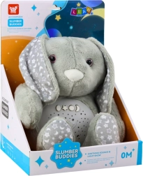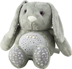 A plüss nyúl csecsemők számára készült, már születéstől kezdve. Finom, kellemes tapintású plüssből készült kímélő szürke árnyalatban, ami megnyugtató hatást kelt. Az interaktív panel a nyuszi hasán különböző funkciókat kínál, amelyek támogatják a gyermek megnyugtatását és elaltatását. A játék nemcsak csecsemők, hanem nagyobb gyerekek számára is ideális, akik félnek egyedül aludni.