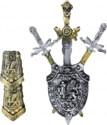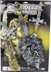 Ez a készlet három különböző lovagi kardot tartalmaz, beleértve egy nagyobb, harcos főfegyverét, egy heraldikai motívummal díszített pajzsot és két kézvédőt, amelyek a páncélzat részeit utánozzák. Minden elem könnyű, de tartós műanyagból készült, ami biztonságos és ellenálló az intenzív használattal szemben.