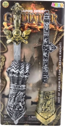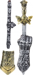 Ez a készlet tartalmaz minden fontos elemet, amivel egy kis lovagnak rendelkeznie kell - kard, öv és két dekoratív kézvédő, amelyek a páncélt utánozzák. Minden alkatrész tartós, de könnyű és biztonságos anyagból készült, napi játékhoz ideális.