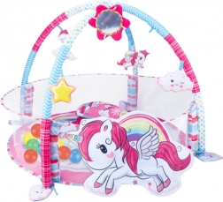 Az oktató játszószőnyeg 3 az 1-ben egyszarvú mintával multifunkciós tér a legkisebbek számára. Ez az aranyos és színes szőnyeg három funkciót egyesít: klasszikus oktató szőnyeg ívekkel és függő játékokkal, száraz medence labdákkal, valamint puha tér a hempergéshez és az önálló ülés tanulásához.