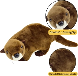 A plüss vidra gondosan készült puha, kellemes tapintású plüssből, meleg, sötétbarna árnyalatban. Az elegáns alakja, kerek orra és kidolgozott részletei, mint például a bajuszok, finom fülek, mancsok és hosszú farok természetes megjelenést kölcsönöznek a játéknak, és első pillantásra melegséget sugároznak.