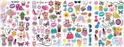 gyermek tetoválás készlettel, amely több mint 70 különböző tetoválást tartalmaz két 20x13 cm-es íven.<7/div>