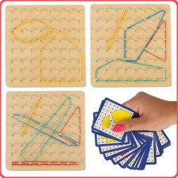 A különböző nehézségű, kétoldalas mintakártyák segítenek a formák, színek, szimmetria és szögek felismerésében. Csak a megfelelő gumikat kell megfeszíteni, és követni a mintát.