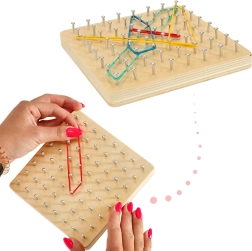 Fedezze fel, hogyan lehet a gyerekeket játékosan megismertetni a matematika alapjaival – formák, szögek és szimmetria. A sűrű tüskehálós falapon a gyerekek különböző hosszúságú és színű gumikat feszítenek ki, és a kártyák alapján vagy saját fantáziájuk szerint alkotnak alakzatokat. A játék fejleszti a kéz–szem koordinációt, a koncentrációt és a logikus gondolkodást.