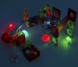 A színes, világító golyók és a reflektorok beragyogják a pályát, és minden építményt látványos élménnyé varázsolnak. Ideális félhomályban való játékhoz és a gyerekek alkotókedvének fokozásához.