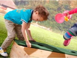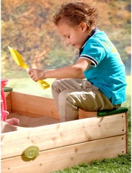 • Tárolóhely: A gyerekek lapátjaikat és vödreiket a tárolóhelyen tárolhatják, mely fa fedéllel van ellátva, s padként is szolgálhat.