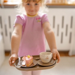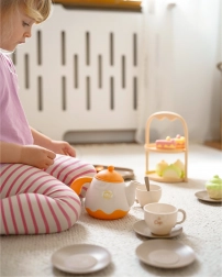 Kanna, csészék, csészealjak, tálca és desszertállvány – a gyerekek teát tölthetnek és finomságokat szolgálhatnak fel, akár egy igazi vendégségben.